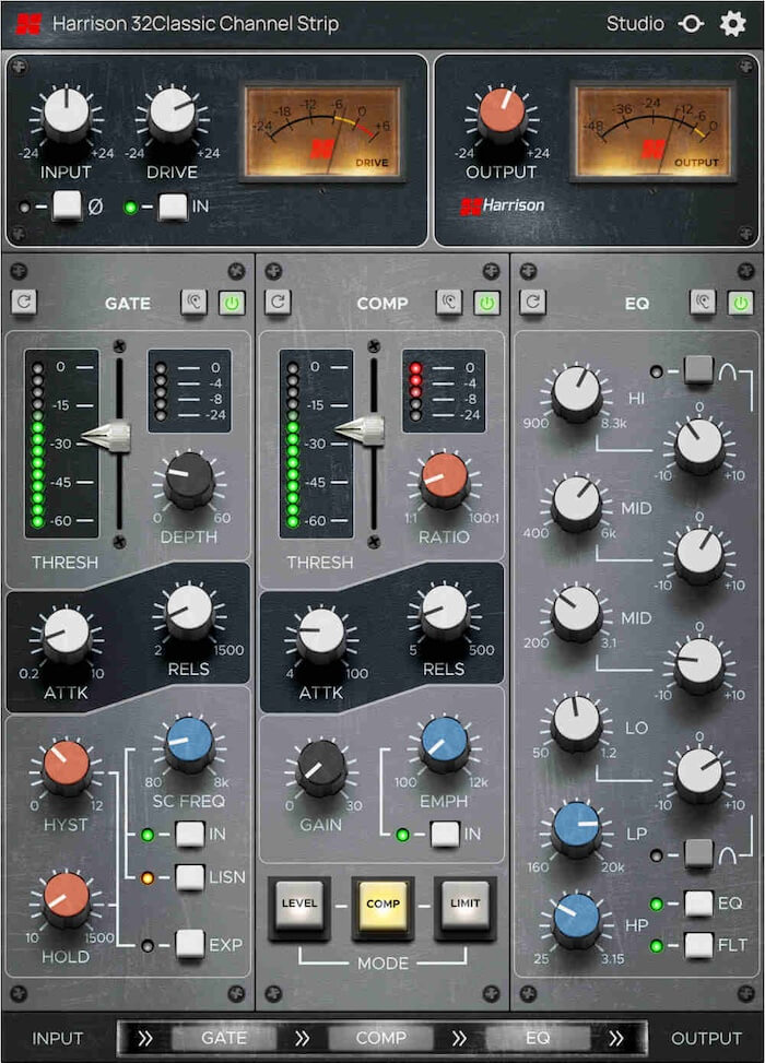 The 32Classic Channel Strip Plug-in by Harrison Audio is a fully featured channel strip complete with four-band parametric EQ, High Pass and Low Pass filters, transformer saturation with ‘Drive’ control, Compressor and Gate/Expander – everything you need to make music with the classic Harrison sound.
